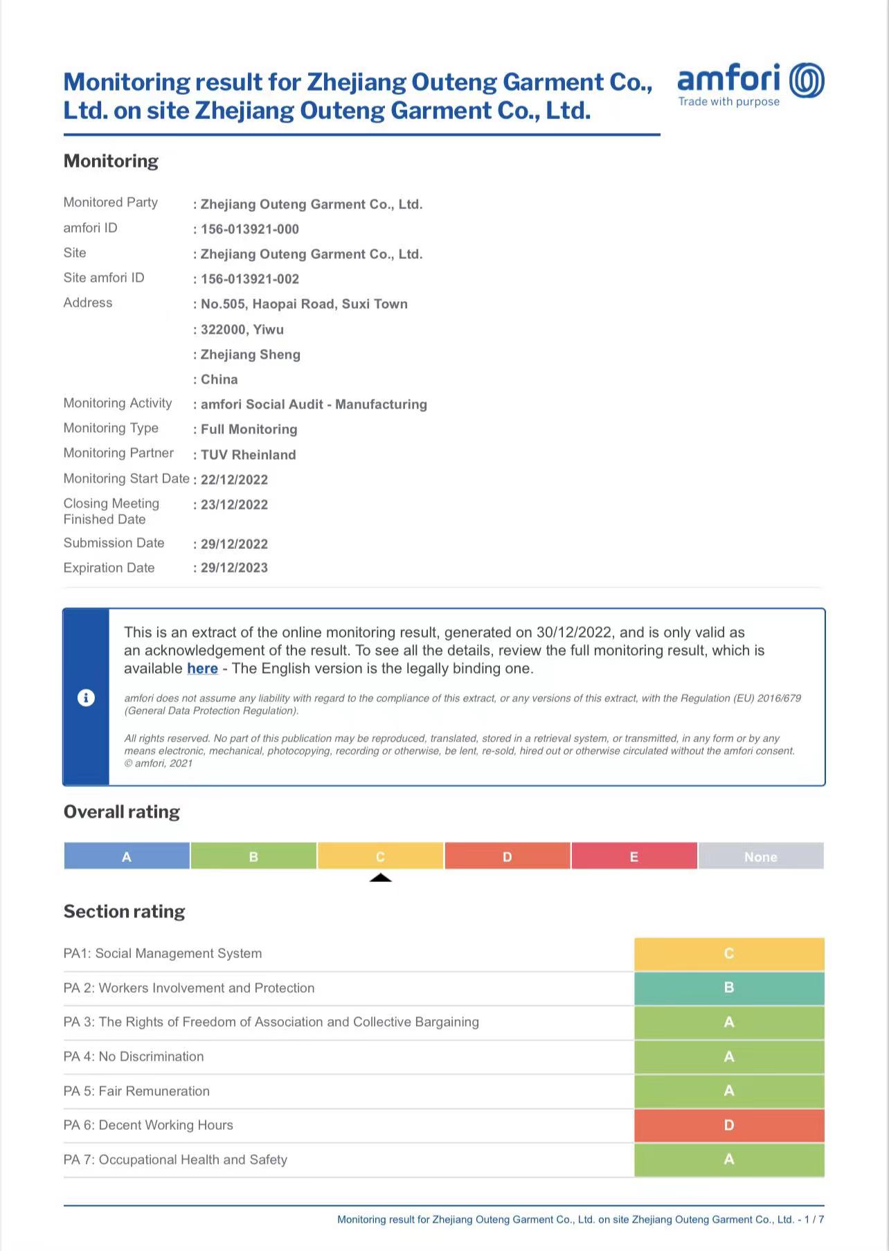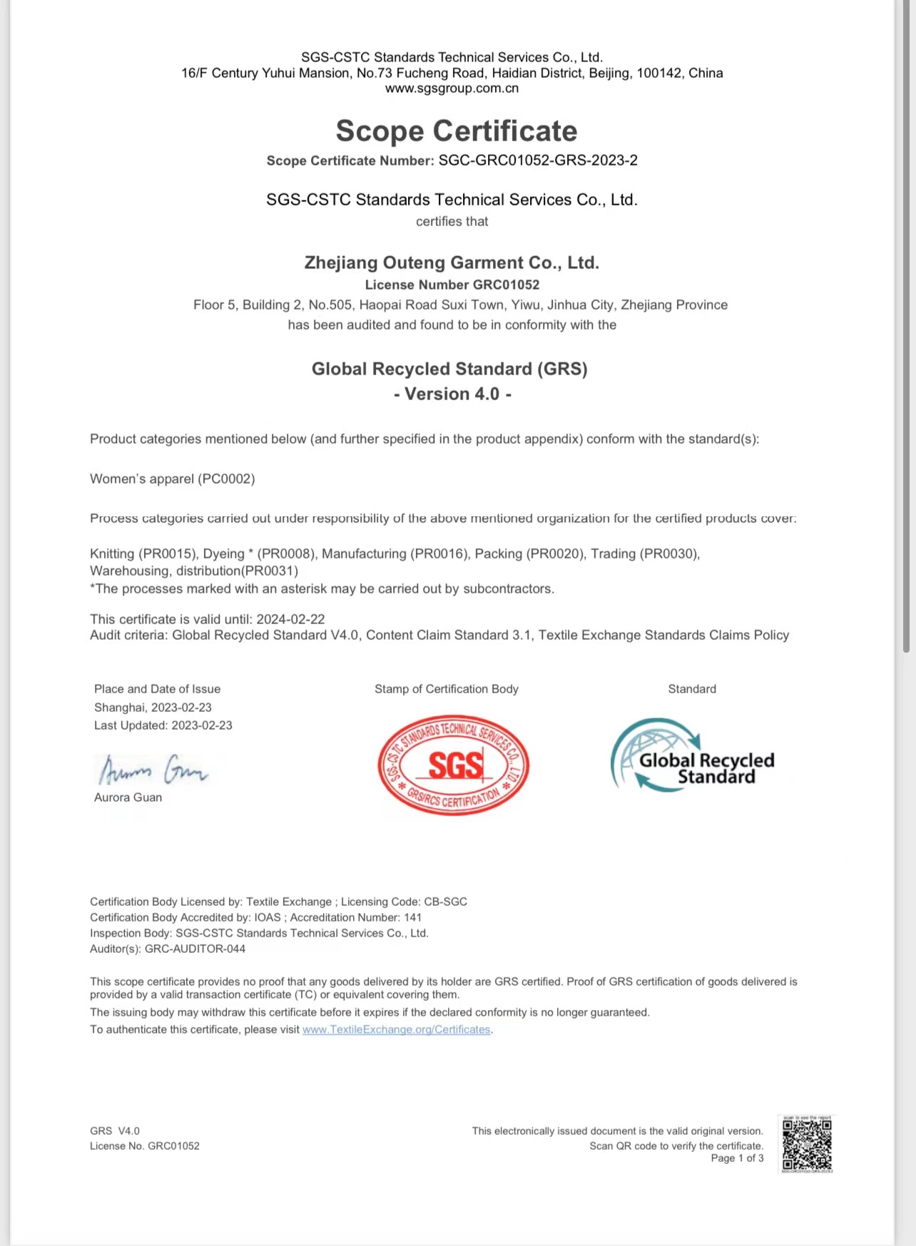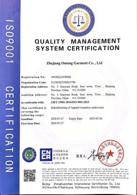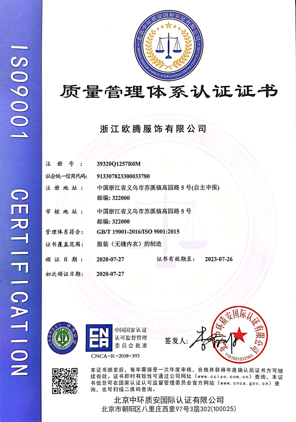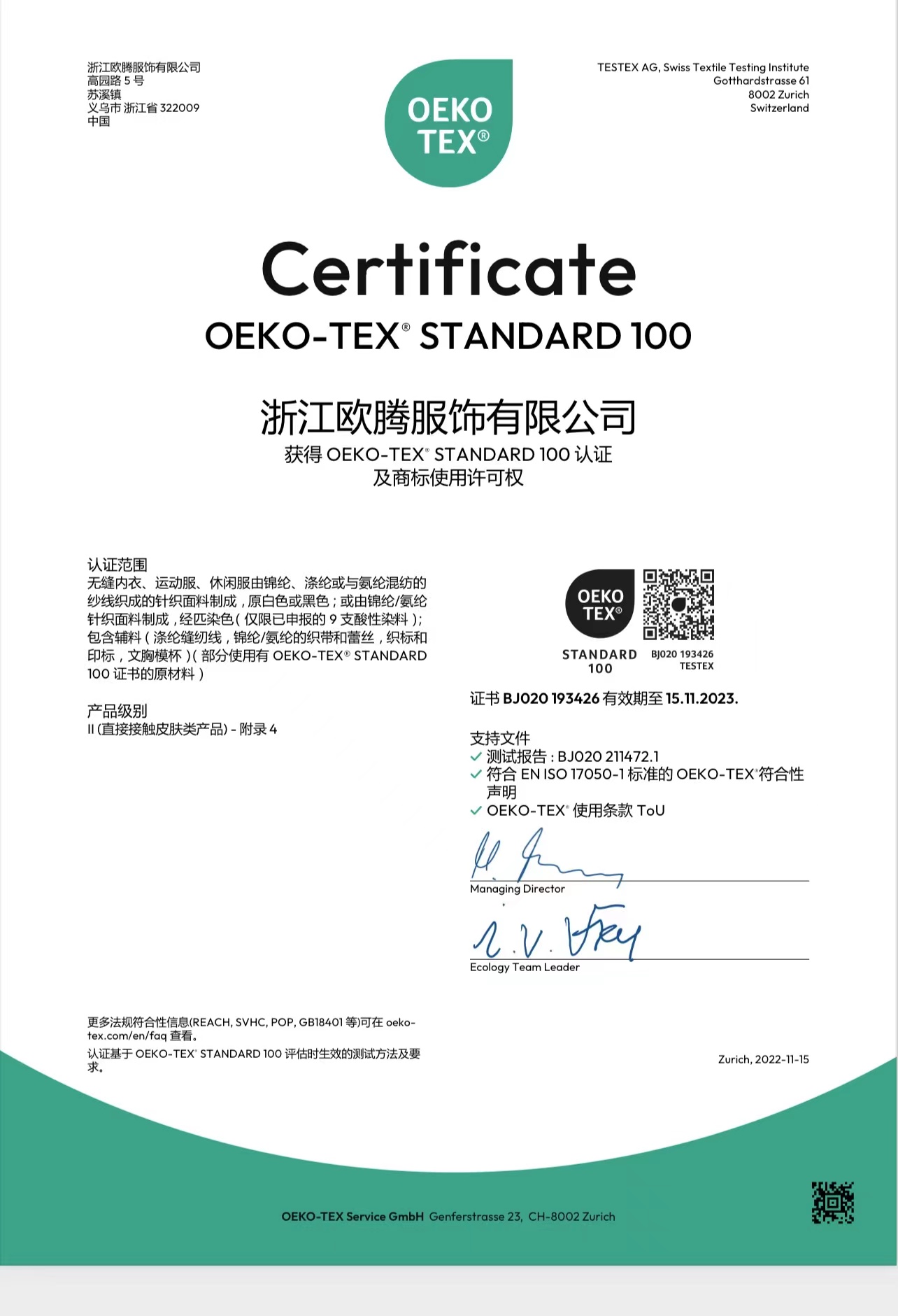 浙江歐騰服飾有限公司位于世界小商品之都-義烏。創(chuàng)立于2015年,是一家專業(yè)生產(chǎn)無縫針織運(yùn)動(dòng)服飾和內(nèi)衣的工貿(mào)一體企業(yè),擁有自主出口權(quán)。 工廠的占地面積約16000平方米 ,引進(jìn)了大型圣東尼、高騰等多種先進(jìn)的制衣設(shè)備300余臺(tái)。月產(chǎn)能可達(dá)90萬件。 歐騰服飾每年投入近百萬資金打樣開發(fā)新產(chǎn)品,有著一支高素質(zhì)設(shè)計(jì)、技術(shù)員工隊(duì)伍。工廠先后通過了ISO 9001質(zhì)量管理體系認(rèn)證、BSCI認(rèn)證、GRS認(rèn)證、OEKO-TEX國(guó)際生態(tài)紡織品認(rèn)證等多項(xiàng)專利檢測(cè)報(bào)告。可提供OEM&ODM服務(wù)。歐騰服飾以一套完整、科學(xué)的質(zhì)量管理體系,生產(chǎn)的服裝從原材料紗線到成衣,質(zhì)量完全能夠滿足國(guó)內(nèi)、國(guó)際質(zhì)量要求。獲得了客戶一致好評(píng)。工廠先后獲得省科技型企業(yè)、國(guó)家高新企業(yè)、義烏市誠(chéng)信講信用單位、規(guī)上企業(yè)、信用AAA級(jí)等榮譽(yù)。